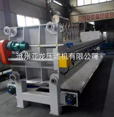 由交替排列的濾板和濾框構(gòu)成一組濾室。濾板的表面有溝槽,其凸出部位用以支撐濾布。濾框和濾板的邊角上有通孔,組裝后構(gòu)成完整的通道,能通入懸浮液、洗滌水和引出濾液。板、框兩側(cè)各有把手支托在橫梁上,由壓緊裝置壓緊板、框。板、框之間的濾布起密封墊片的作用。由供料泵將懸浮液壓入濾室在濾布上形成濾渣,直至充滿濾室。濾液穿過(guò)濾布并沿濾板溝槽流至板框邊角通道,集中排出。過(guò)濾完畢,可通入清洗滌水洗滌濾渣。洗滌后,有時(shí)還通入壓縮空氣,除去剩余的洗滌液。隨后打開(kāi)壓濾機(jī)卸除濾渣,清洗濾布,重新壓緊板、框,開(kāi)始下一工作循環(huán)。
