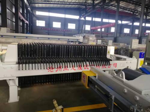 壓濾機的嵌入式(封閉式)排列緊密,在壓板和止推板的共同作用下形成封閉的過濾室。在輸送泵的壓力下,材料被送入過濾室。此時,濾布兩側的壓差使固體物質被攔截在過濾室內,并逐漸積累。濾餅液體通過濾布沿過濾布沿過濾板槽流入下出口,集中排放,直到壓濾結束。松開濾板后,可手動或使用拉板車自動依次拉開濾板卸料。